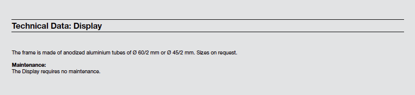 The Display is best suited for mobile or permanent use out- doors. The frame is made of anodized aluminum tubes and cast aluminum joints, no corrosion! The frame is reusable, the advertising space can always be replaced!